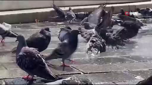 Hava sıcaklıklarının mevsim normallerinin üstünde seyrettiği Bursa'da güvercinler, kanatlarını açıp suyun altında serinledi.